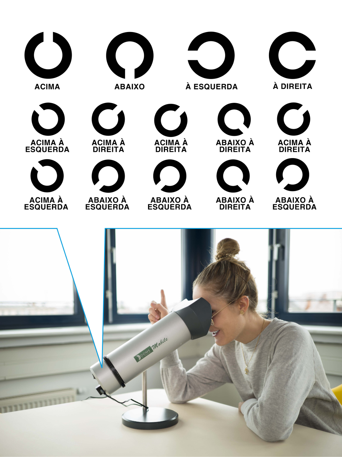 Coloque ambos os olhos no aparelho. Veem-se círculos com aberturas. Favor dizer ao instrutor onde se encontra a abertura em cada círculo, linha por linha, da esquerda à direita. Espere em seguida até o instrutor colocar a chapa seguinte.